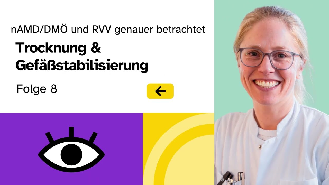 In diesem Video spricht die Augenärztin Prof. Dr. Schaub über die Trocknung und Gefäßstabilisierung der Netzhaut in der Behandlung von Netzhauterkrankungen, wie die feuchte altersabhängige Makuladegeneration (nAMD), das diabetische Makulaödem (DMÖ) und das Makulaödem infolge eines retinalen Venenverschlusses (RVV).