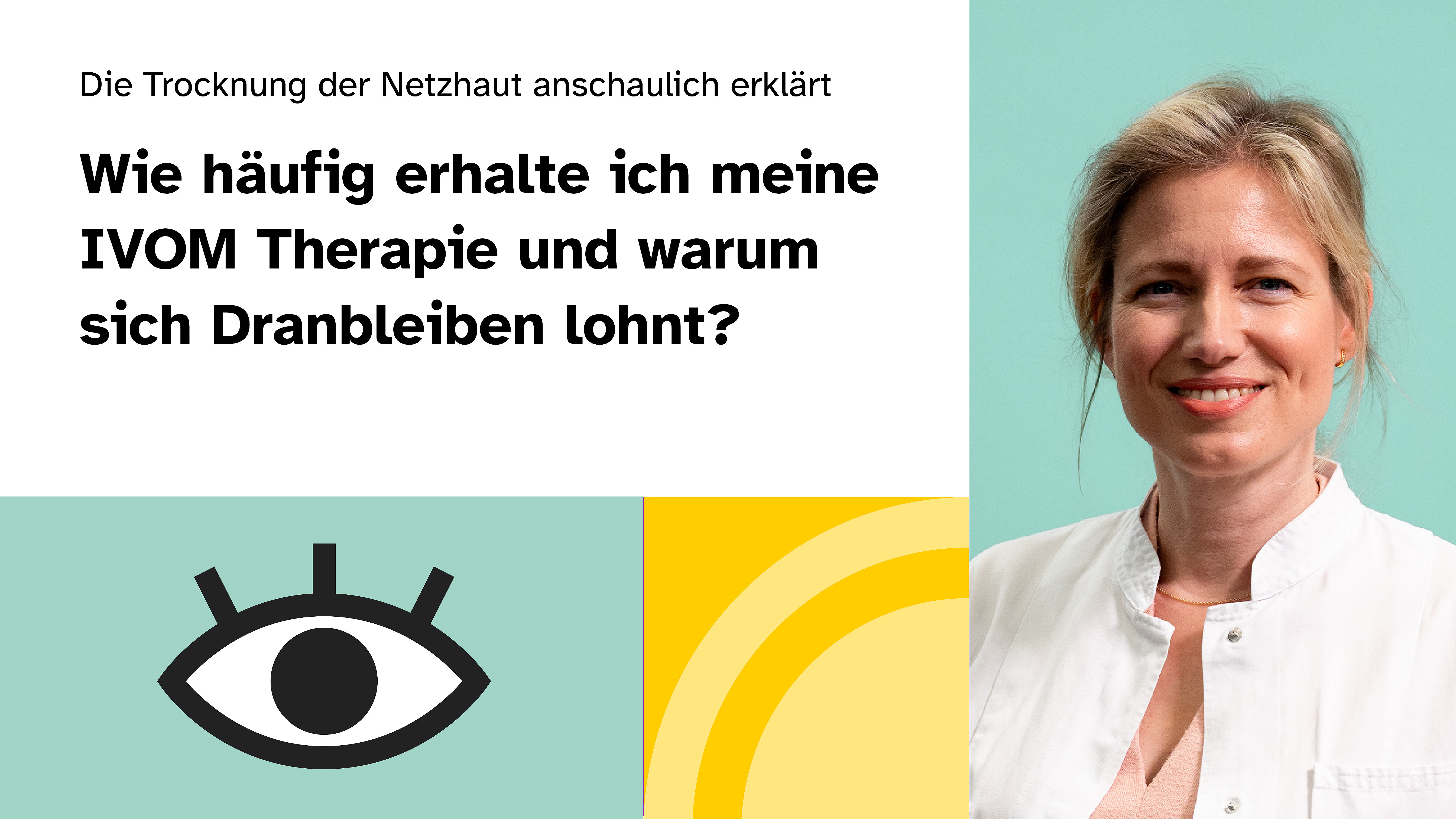 In unserem Video erklärt Ihnen Augenärztin Dr. med. Berenike Kunzmann, wie engmaschige Intervalle gerade zu Beginn der Therapie dabei helfen, die Netzhaut zu trocknen – und dazu beitragen können, die Abstände im Verlauf auszuweiten. Denn heute gibt es Medikamente, die die Netzhaut vier Monate oder sogar länger trocken halten können. Wenn Sie also konsequent die Behandlungstermine einhalten, haben Sie bessere Chancen auf ein längeres Therapieintervall. Auch ein Therapiewechsel kann sich lohnen – sprechen Sie mit Ihrem Behandlungsteam.