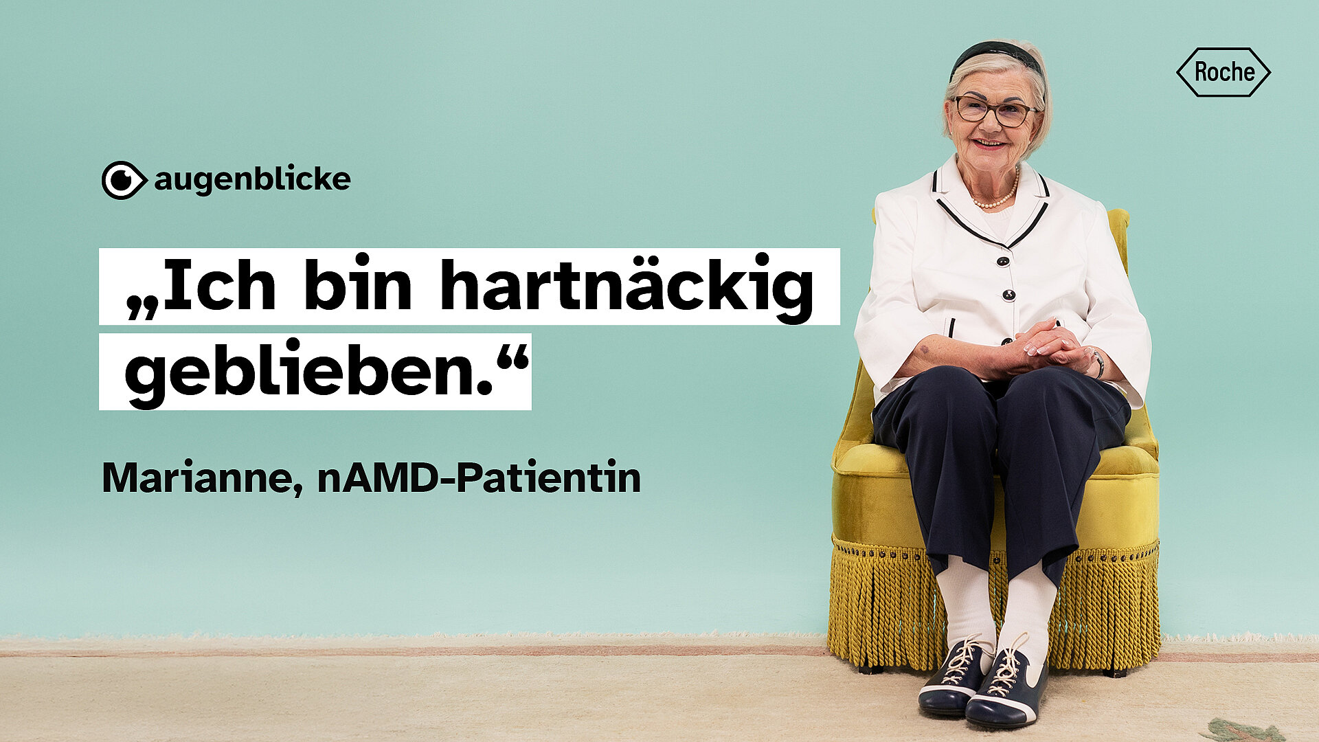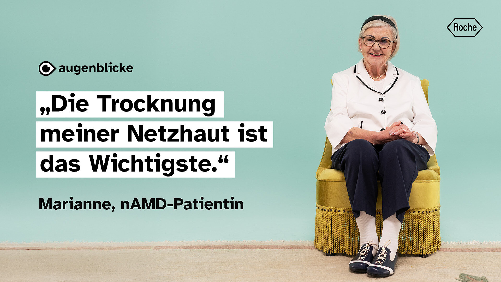 Marianne hat nAMD – eine feuchte altersabhängige Makuladegeneration. Bei ihr sammelt sich Flüssigkeit in der Netzhaut. Die Folge: verzerrtes Sehen, Unsicherheit im Alltag, Angst vor dem Verlust der Sehkraft.